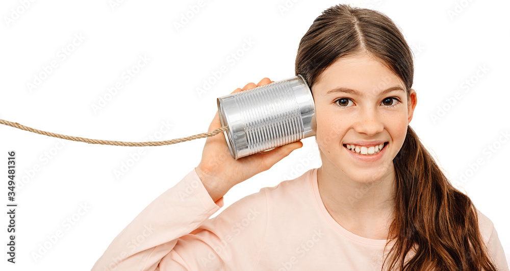 Positive girl with a tin can near the ear, playing the phone. I hear you well, child isolated on white