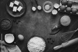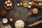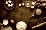 Frame of various baking ingredients on a dark vintage background. A variety of products for making chocolate cake, cookies, muffins. Top view, flat lay, copy space.