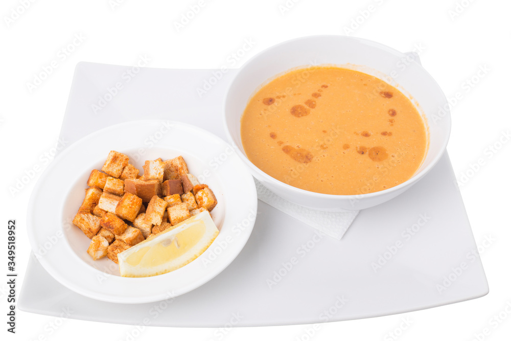 Cream soup with breadcrumbs on a white tray.