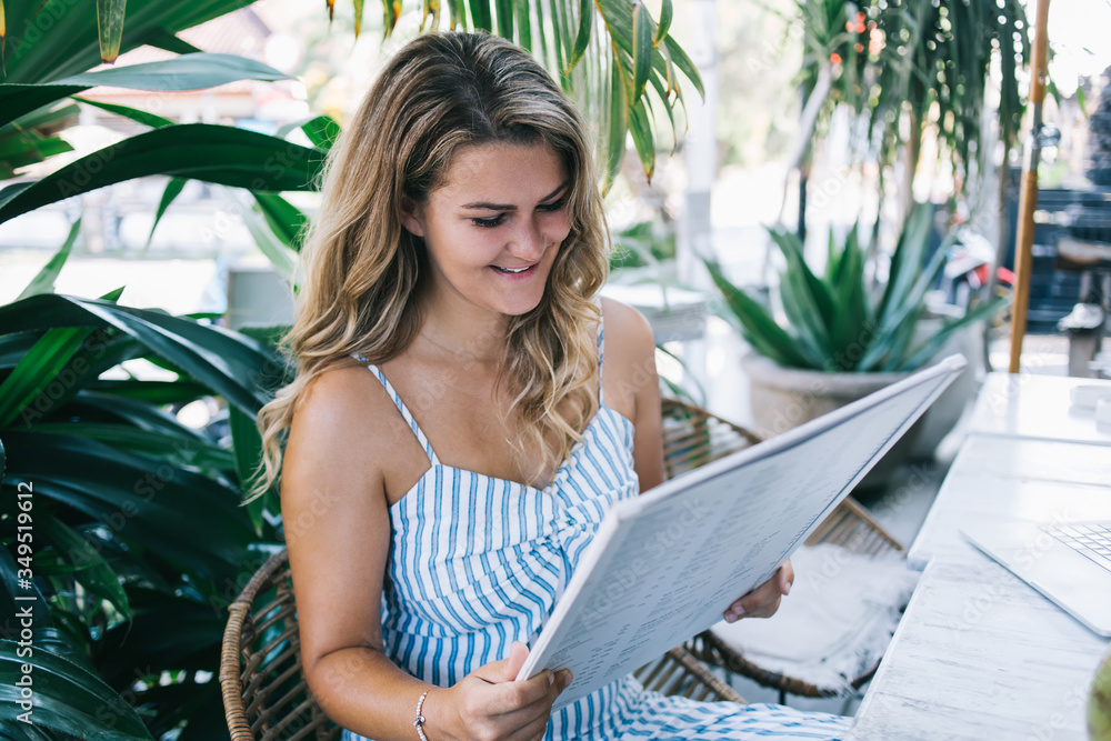 Smiling female inspecting menu in cafe