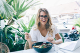 Excited smiling adult female eating yummy food at table outside cafe