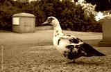 A large duck with a red head and black and white color stands in the reserve