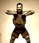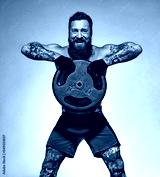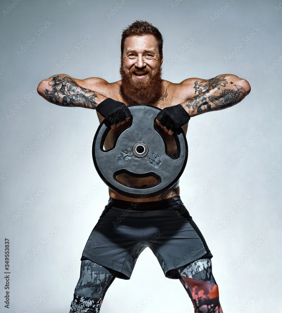 Athletic man doing exercise with heavy weights plate. Photo of man with naked torso on grey background. Strength and motivation