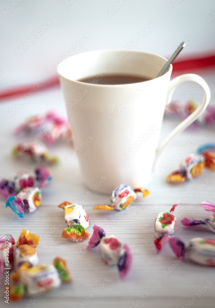 A white Cup of coffee with a spoon is on the table, and colored candies are lying around