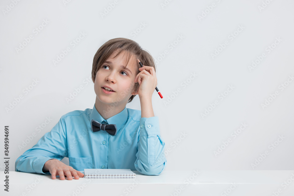 a boy in a blue shirt looks up thoughtfully, a pencil in his hand, writes a plan, an idea, dreams about the future, the concept of study, education, business. Isolate on white background