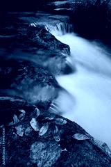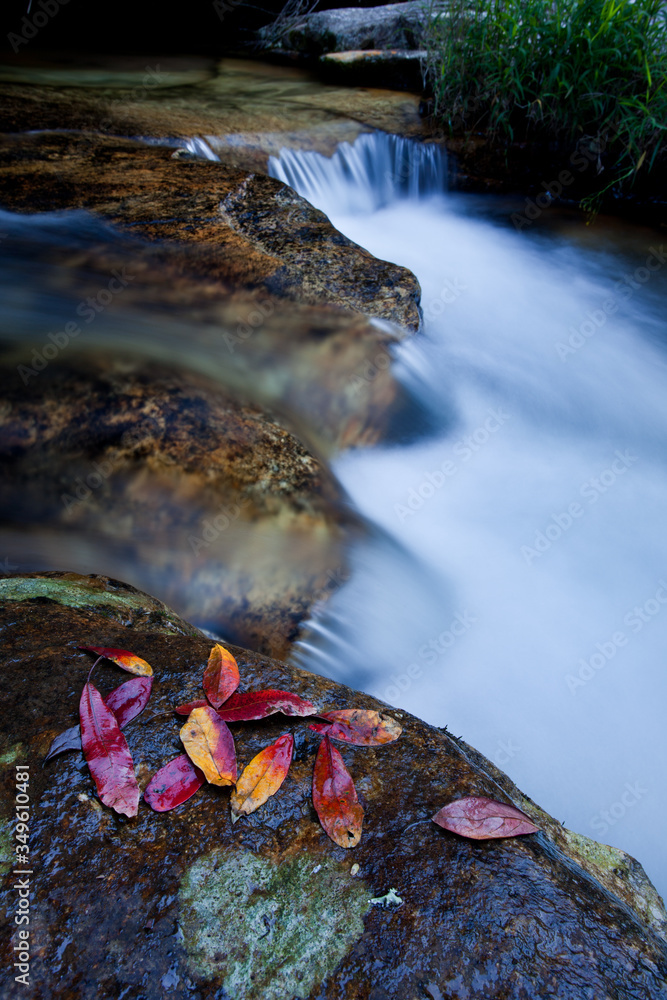 Long exposure close up landscape with waterfall and leaves, flowing water
