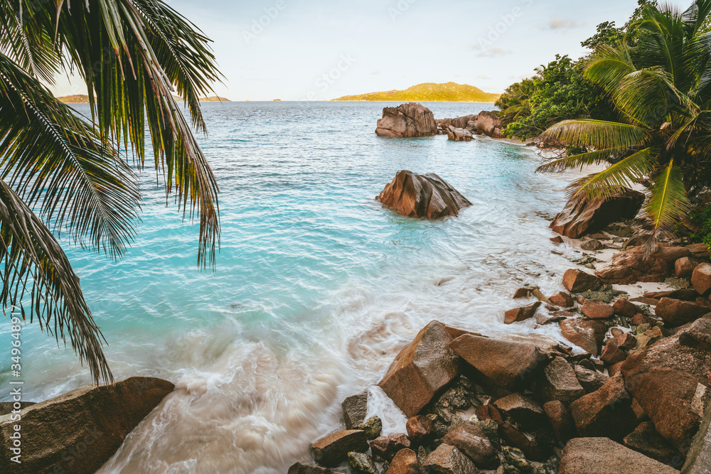 Sunset at tropical beach Anse Patates with granite boulders on La Digue Island, Seychelles