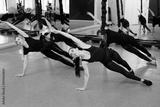 Group of active sports girls in black sportswear are engaged in budgie fitness in the gym. Bungee jumping in the gym