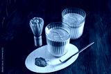 Matcha green tea latte with matcha powder and bamboo whisk on wood background.
