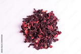 Pile of dry hibiscus karkade herbal tea isolated on white background.