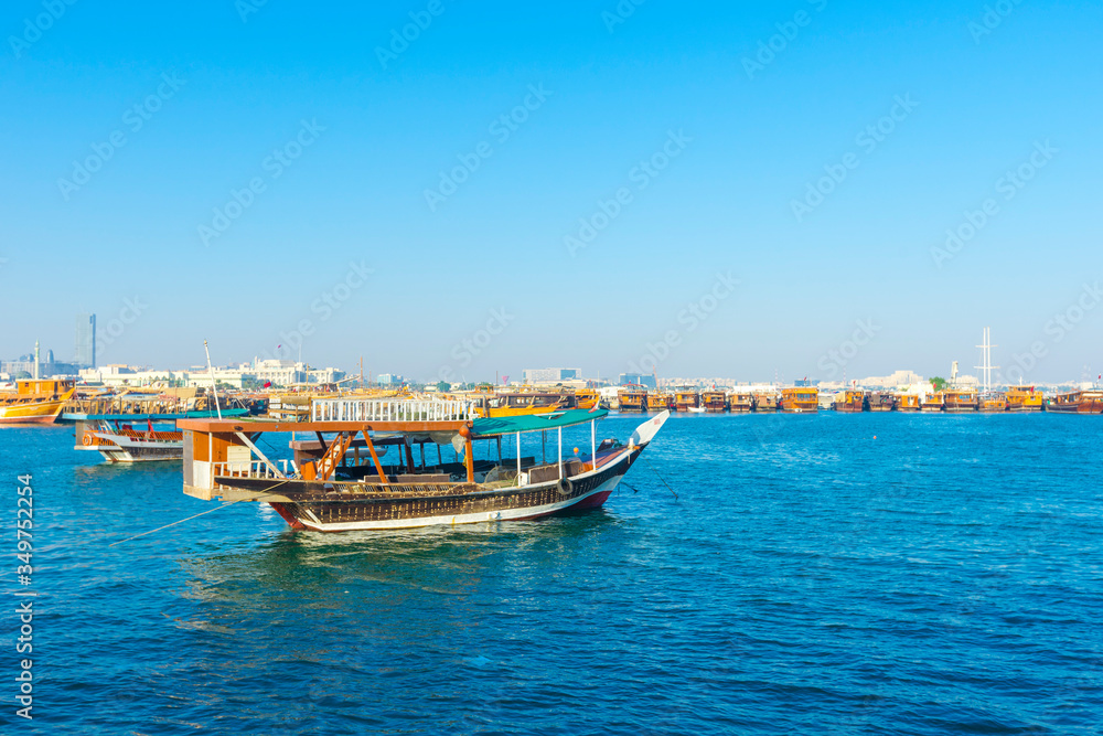 Traditional boats called Dhows are anchored in the port near Museum of Islamic Art Park,Doha, Qatar.