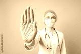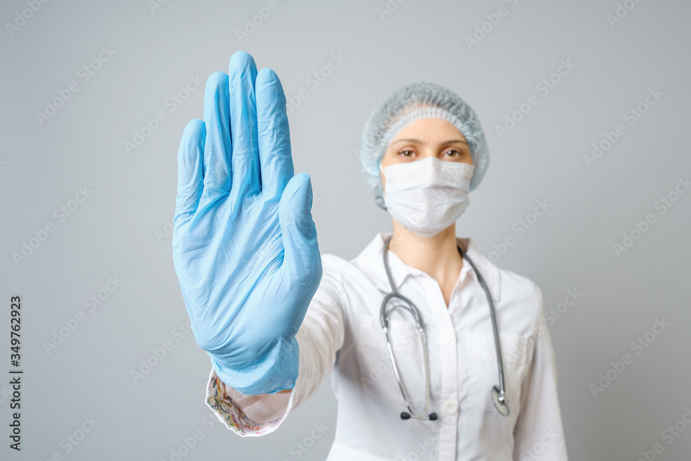 Doctor wearing medical face mask and disposable gloves showing stop gesture