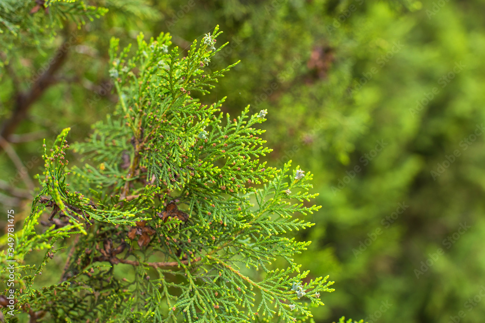 close-up of thuja twigs on a blurry green background