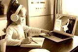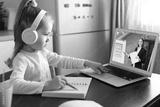 Distance learning. Cheerful little girl girl in headphones using laptop studying through online e-learning system.