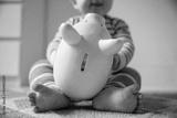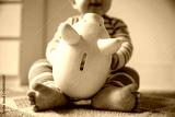 Family finance concept. Young baby playing with a piggy bank money box
