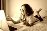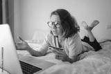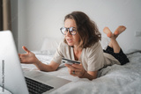 Beautiful young curly woman is lying on the bed in front of a laptop with a credit card in her hands and is looking seriously and unhappily at the laptop screen