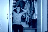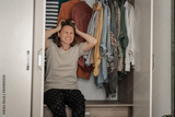 Beautiful young curly woman does not know what to wear, sits in a closet with clothes in sadness and depression