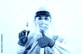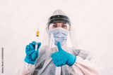 A happy smiling laboratory worker with blue face mask, gloves and protective glasses is holding a syringe and shows thumps up sign. Scientists finding a cure treatment and vaccine for Covid-19