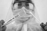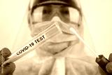 Corona virus pandemic concept: Laboratory scientist with blue mask, medical hygienic protection gloves and glasses holding an empty test tube and stick for COVID-19 testing. Shallow depth of field