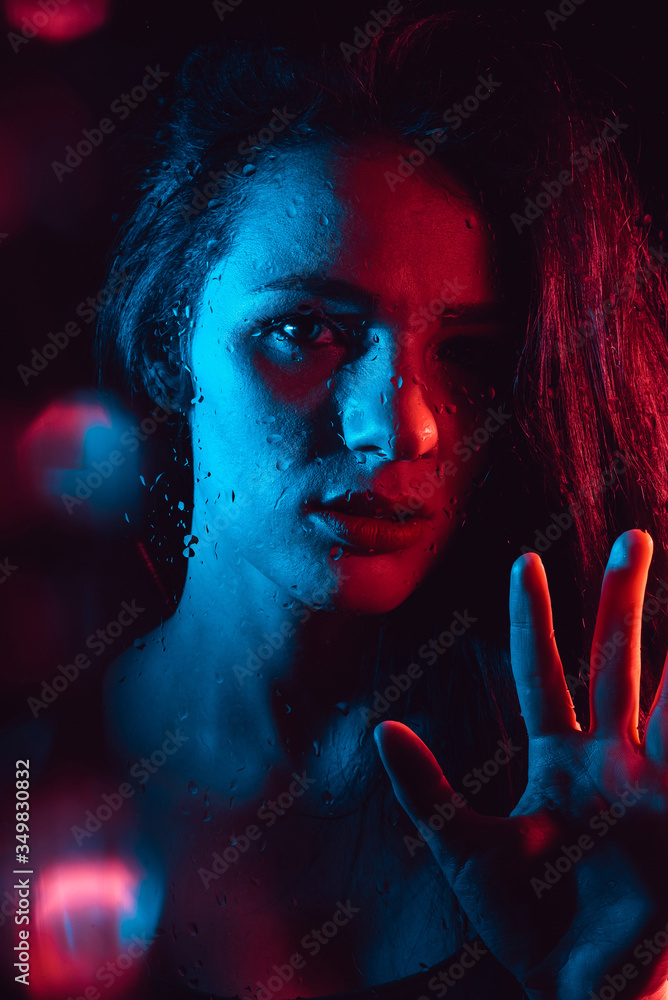 Sensual portrait of a beautiful attractive girl looking through the glass with raindrops