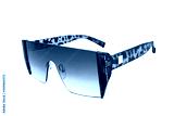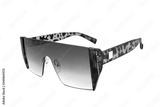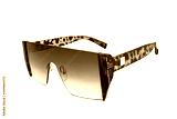 Rap star hip hop style rimless sunglasses with brown color gradient mono lens, flat top and leopard texture earpiece, isolated on white background, side view.