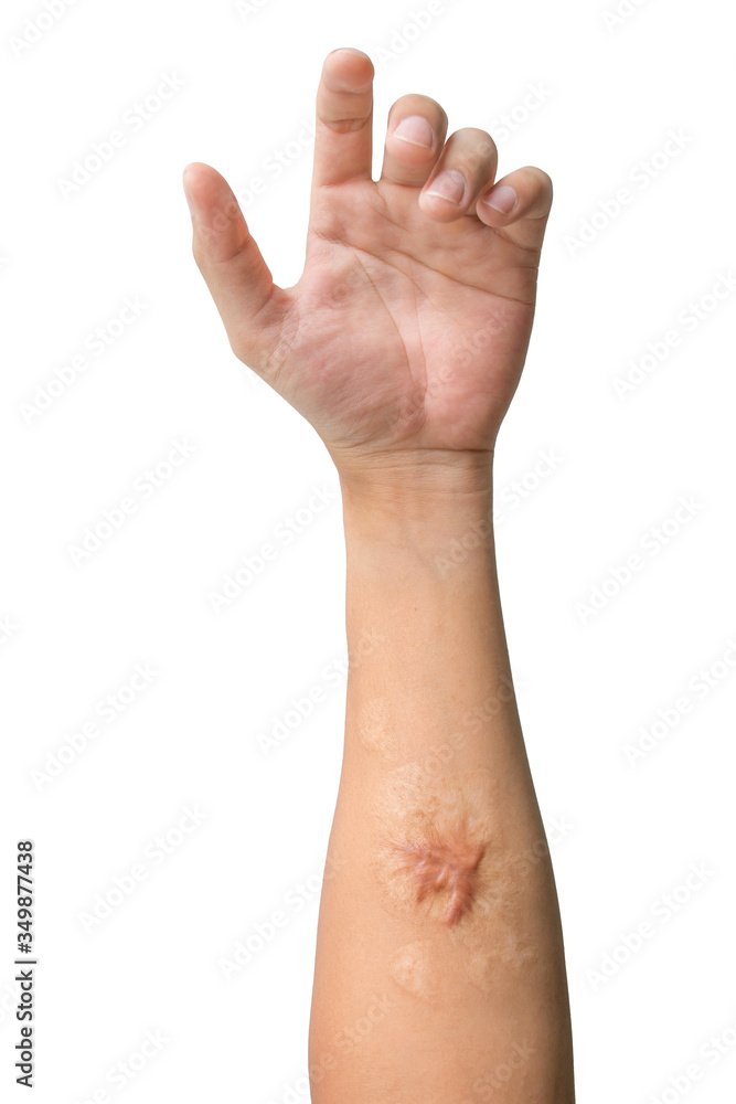 Man arm and hand with Keloid scar (Hypertrophic Scar) on skin after accident isolated on white background.