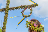 Mit Blumenkranz am Mittsommerbaum in Schweden