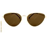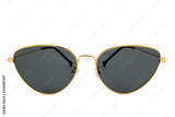 Cat eye sunglasses with black lenses and triangle shaped gold wrap around frames isolated on white background, front view.