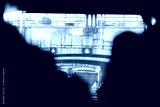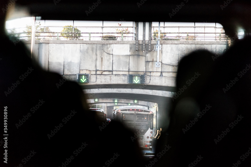 Abstract closeup back of people sitting in bus on trip tourist travel with urban view through window of New York City, NYC highway road tunnel arrows
