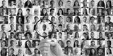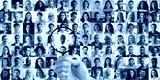 Male hand of hr manager, employer holding magnifying glass choosing finding african job candidate among many multiracial professional people faces collage. Staff recruitment, human resource concept.