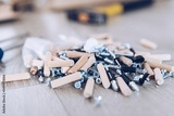 Various types of screws, connectors and tools. Furniture assembly accessories.