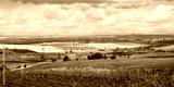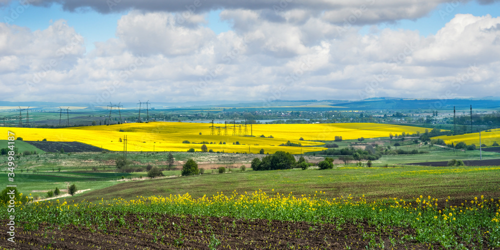 Panoramic view of yellow fields of oilseed rape and green meadows, electric poles and lakes at springtime