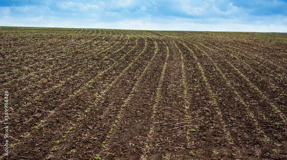 field of sugar beet in spring, young sprouts and sky on the horizon