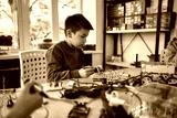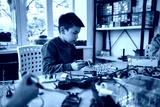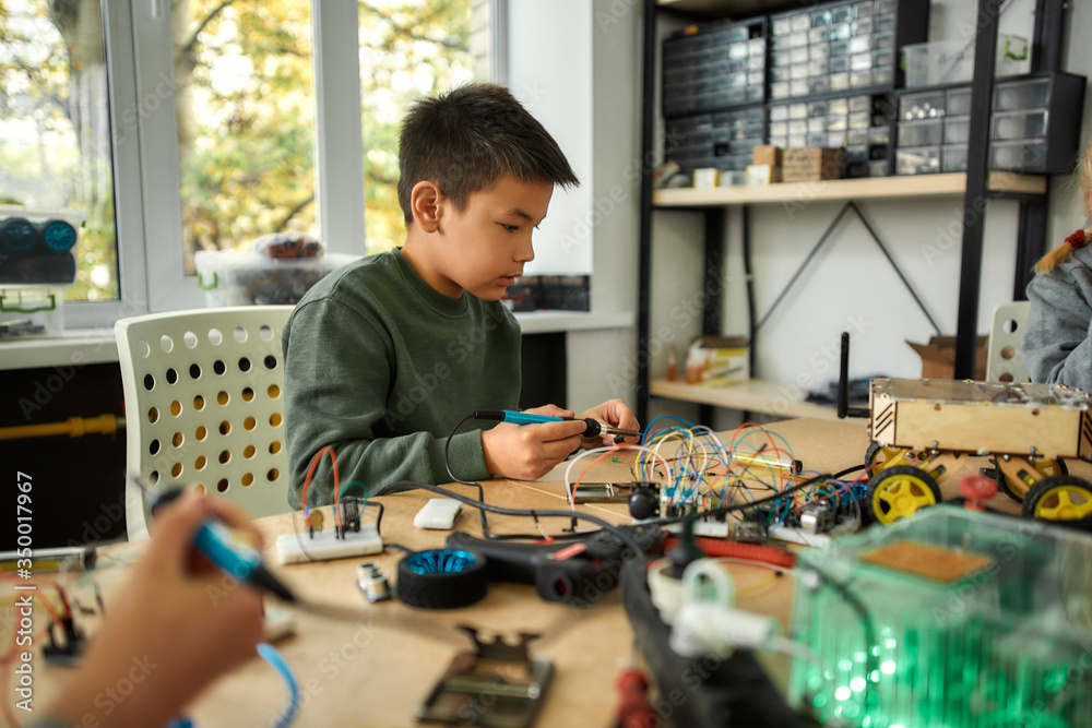 Passion that builds excellence. Young engineer using soldering iron to join chips and wires. Robotics and software engineering for elementary students. Inventions and creativity for kids