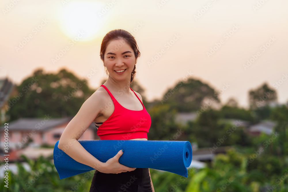 Asian woman holding yoga mat from home at rooftop when Covid19 outbreak and lockdown, healthy or Meditation Exercise, yoga workout at home, coronavirus pandemic and quarantine, sports and healthcare