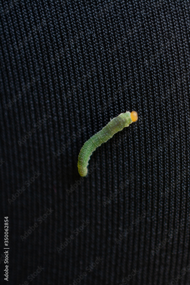 Green worm caterpillars animals isolate on black fabric