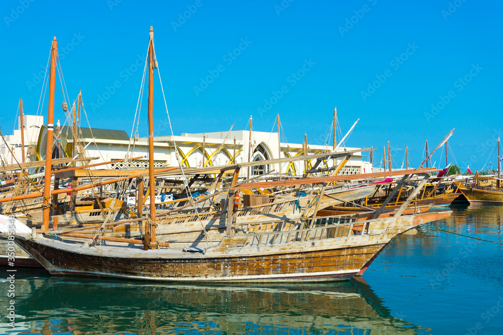 Traditional boats called Dhows are anchored in the port near Museum of Islamic Art Park,Doha, Qatar.