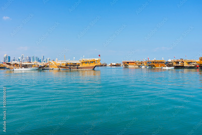 Traditional boats called Dhows are anchored in the port near Museum of Islamic Art Park,Doha, Qatar.