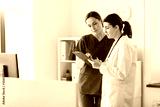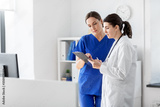medicine, healthcare and people concept - doctor and nurse with clipboard at hospital