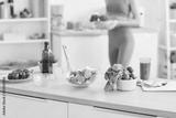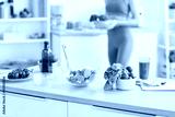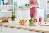 Close up of healthy food ingredients and salad bowl on kitchen counter with blurred shape of fit young woman in background, copy space
