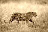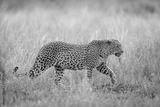 One female Leopard walking through the savanna grass Kruger park South Africa
