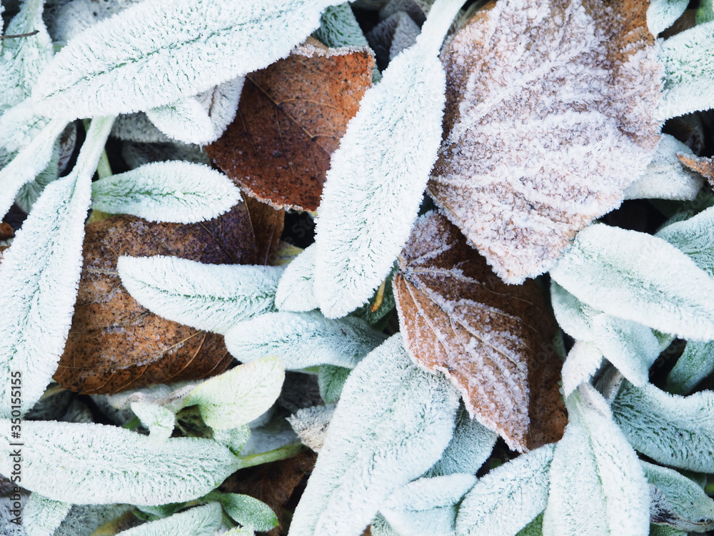 leaves on the ground with frost in winter. Frost on the leaf and grass. Autumn leaves covered with frost - background