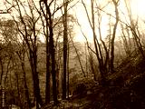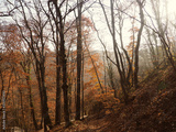 Autumn forest trail. Beautiful morning in the misty autumn forest with sun rays, Path through autumn woods