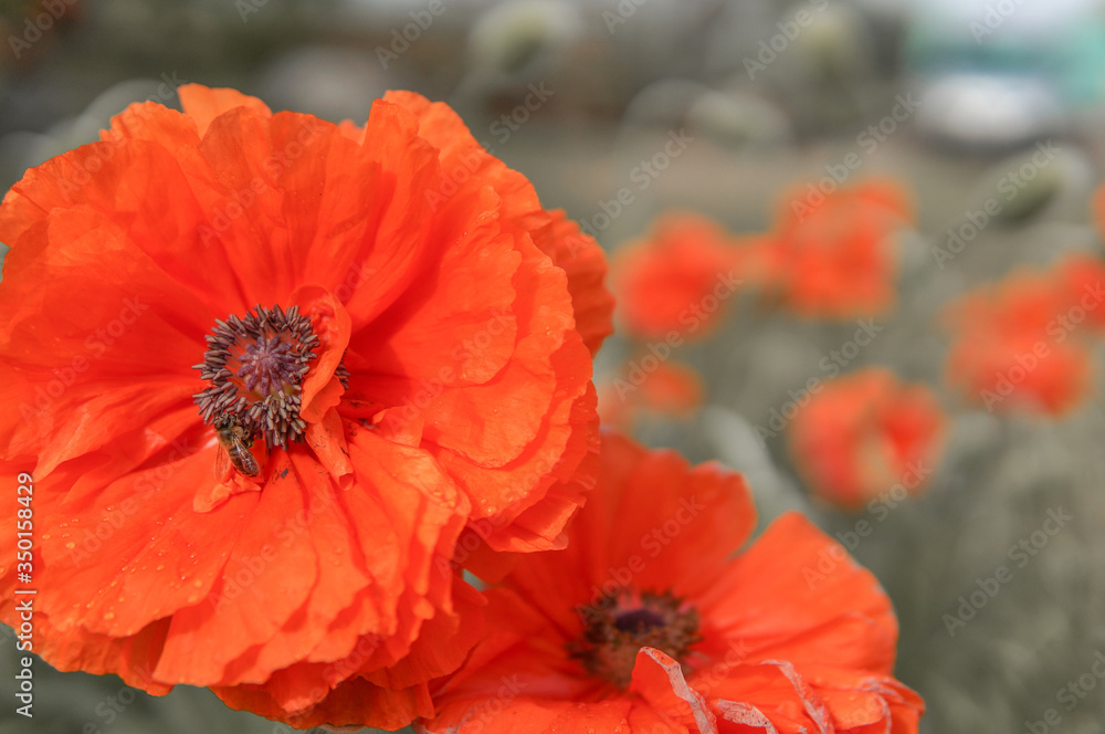 close up of orange poppy flowers in a fiel