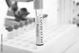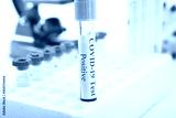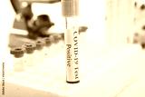Test tube with a positive COVID-19 test on a white background