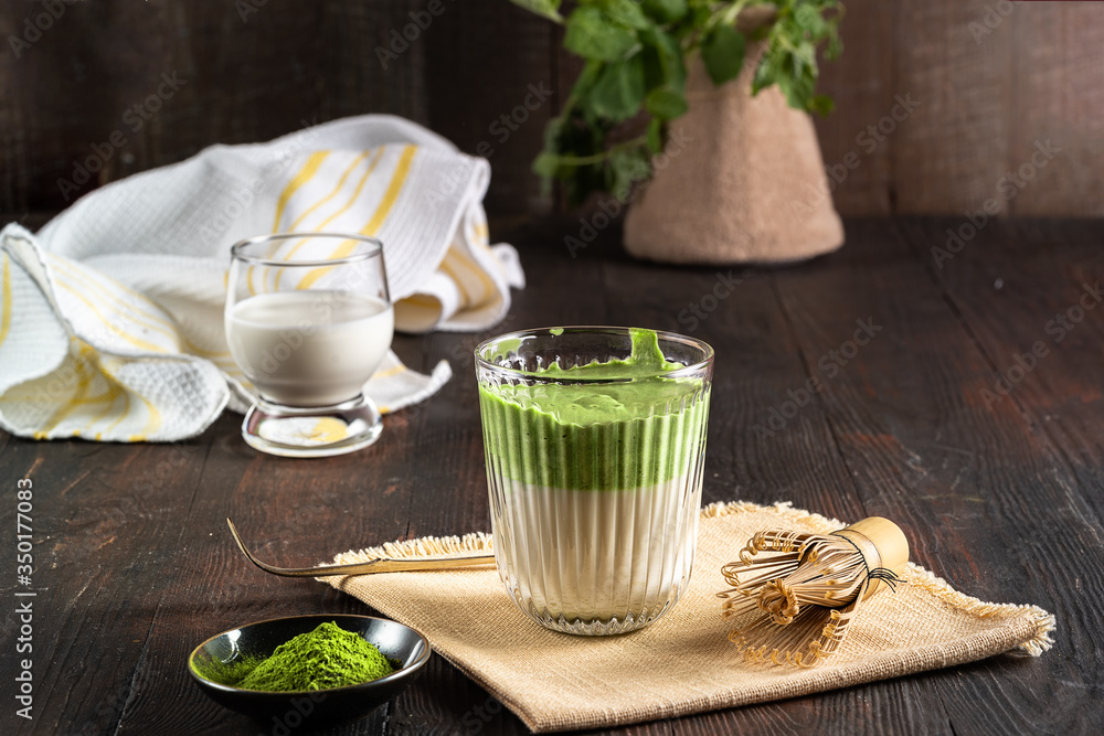 Matcha green tea latte with matcha powder and bamboo whisk on wood background.