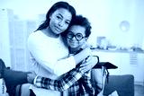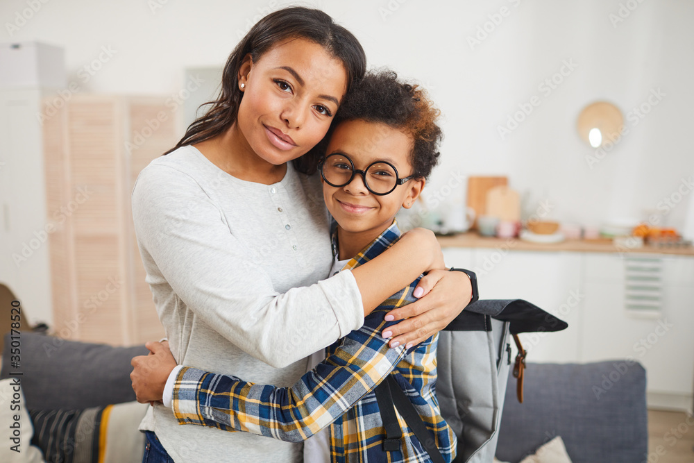 Waist up portrait of happy African-American mom embracing son while sending him to School in September, both looking at camera