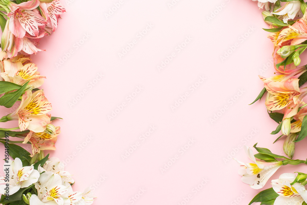 Yellow and pink flowers Alstroemeria on a pink background with copyspace