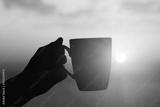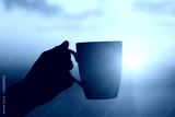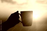 young woman's hand holding coffee cup and drinking morning coffee at sunrise outside