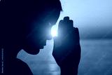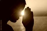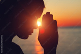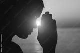 silhouette of young woman raising hands praying at sunset or sunrise light, practicing yoga on the beach, religion, freedom and spirituality concept
